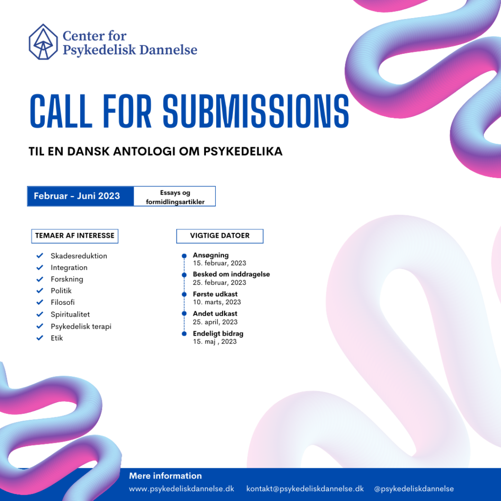 NB. Vi har nu lukket for ansøgninger. Over 20 forskere og fagfolk har meldt sig til at bidrage til antologien og vi har modtaget over 10 ansøgninger. Du kan allerede nu forudbestille antologien til en stærk pris her. Vi har inviteret en række fagfolk til at bidrage til en dansk antologi om psykedelika. Idéen med antologien […]